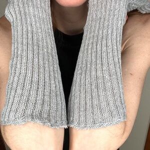 Unisex grey sweater knit ribbed arm warmers with frayed edges. Soft and cozy. Elbow length. Great for texting and driving! Pefect for your gothic, y2k, 90's, punk, alternative outfits.