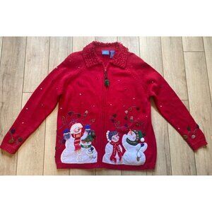 Natural Reflections Knit Full Zip Grandma Sweater Cardigan Ugly Christmas Lights Snowmen Red Small