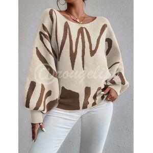 Knit Graphic Pullover Sweater Beige Brown Bishop Sleeve Stretchy