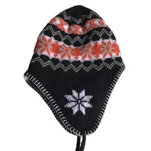 Knit Hat with Ear Flaps Intarsia Chunky Tie Neck Winter Cap Apres Ski Snowboard