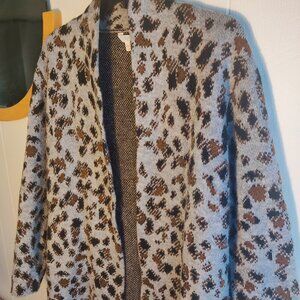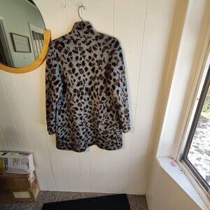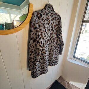 Savy and fashionable faux animal print sweater coat. By Time & Tru in Acrylic, polyester and Spandex. Can be belted, loopholes accomodate a 1.25" belt. Dimensions 39" Length, 24.5" pit to pit.