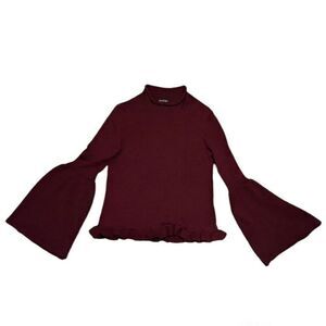 Knit & Lynk Bell Sleeve Sweater Maroon Red Wool Blend Ruffle Hem High Neck M