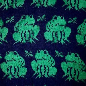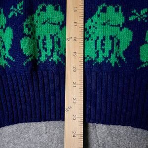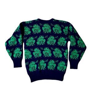 Keywords: Knit Pics wool sweater, frog knit sweater, animal print sweater, cottagecore sweater, whimsical wool pullover, blue green wool knit, cozy winter sweater, long sleeve wool top, novelty knit sweater, unique animal sweater, Casual, Everyday, Warm, Handmade Sweaters