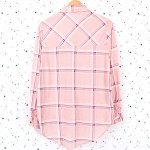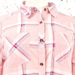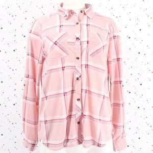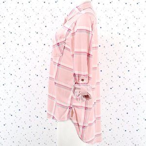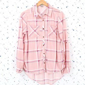 Knit Plaid Button Up Shirt Hi Lo Hem Pink Ivory
