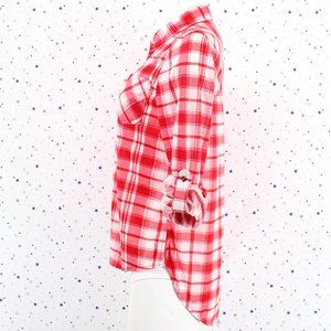 Knit Plaid Button Up Shirt Hi Lo Hem Red Off White