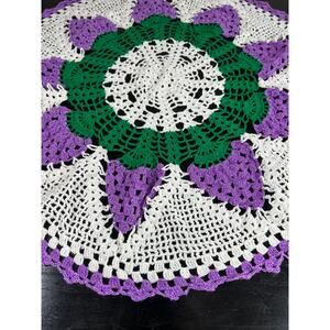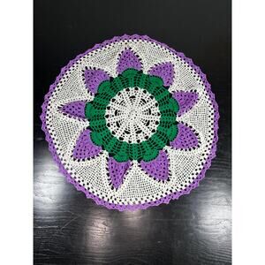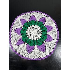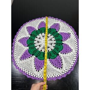 Table Cover Knit Round Doily- White Purple Green- 25" diameter- cottagecore