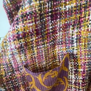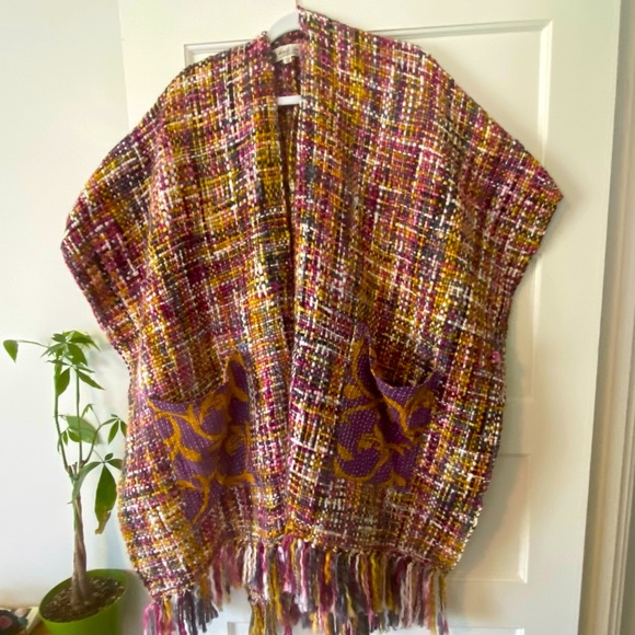 NWOT (this brand doesn’t place tags) soft knit ruana with fringe. Hand stitched from families in India. Sustainably sourced and comes from a small business. Fabric is made from recycled kantha and cotton. One of a kind piece.