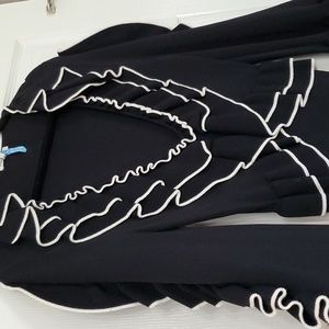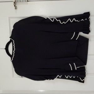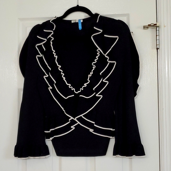 Elegant flowy knit ruffle top. Short waisted, 3/4 sleeves. Long v-neck front.