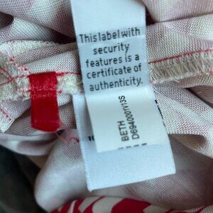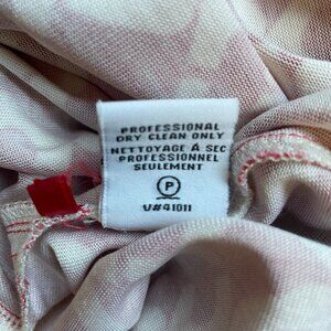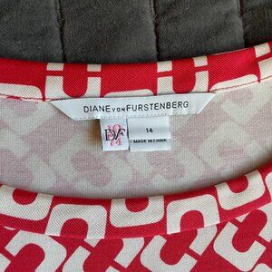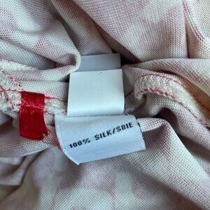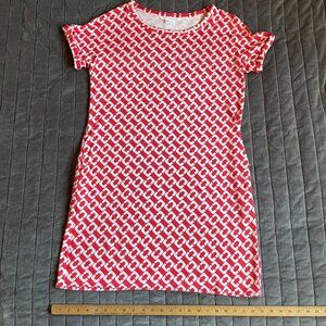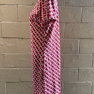 Short sleeve T-shirt style dress in knit silk in a geometric chain link patter of red and cream. It has pockets!! It is a size 14 but I (size 0-2) wore it as an oversized dress, the knit silk fabric drapes so nicely.