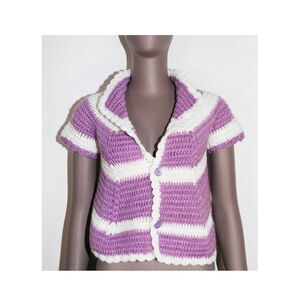 Knit Striped Purple White Button Down Collared Short Sleeve Crop Top