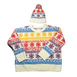Fair Isle Pullover Knit Sweater & Winter Cap Hat Rainbow Colorful Matching