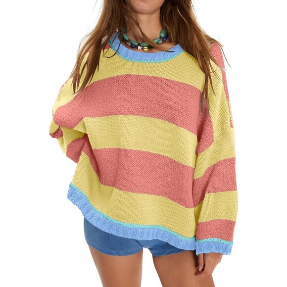 Knit Sweater Women's Oversized Striped Color Block Fall Long Sleeve Crewneck