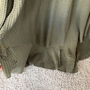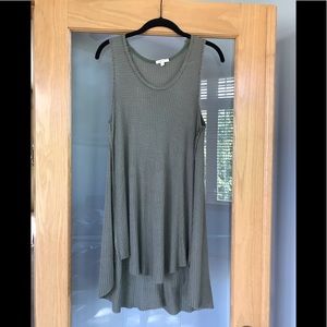 Size Medium Mystree Army/Olive Green sleeveless Knit Tank. Has a waffle weave type pattern, is shorter in the front and longer in the back, and is in great condition! Will look great under a cardigan or jacket!!