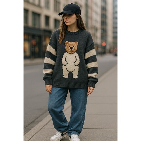 Knit Teddybear 3D Sweater O/S Pullover Striped Gray Cream Fuzzy Cozy Whimsygoth Pullover Boho Cottage Beachy Coastal Indie Hippie Streetwear Rave Kidcore. Unisex.