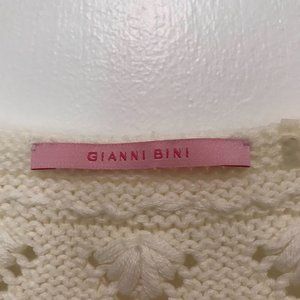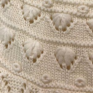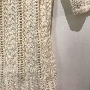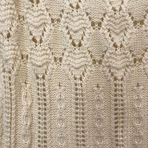 Off white knit top with patterns. 3/4 length sleeves. Deep round neckline.