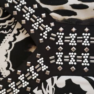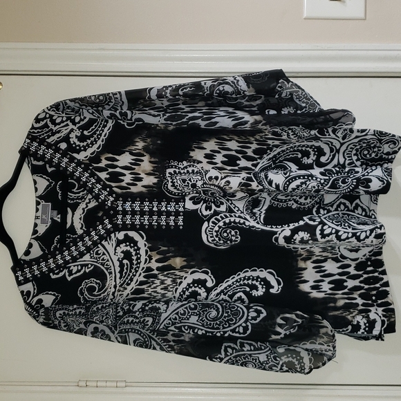 Knit Top w/sheer 3/4 sleeves and embelishments at neckline. Washed gentle cycle, hung to dry.