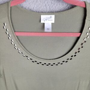 Knit Top Blouse Womens L Green Metallic Studs Scoop Neck Short Sleeves Light