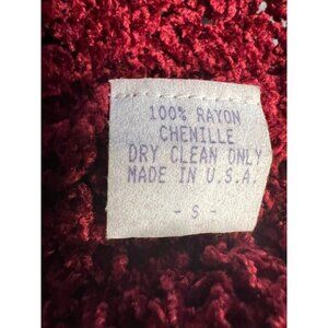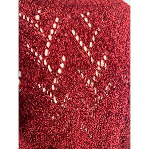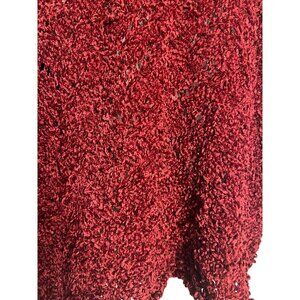 Knit Ware Elements, Chic red knit sweater with a round neck. The design features 3/4 sleeves, open knit detail, and a slightly cropped, baggy fit. The piece is oversized, made entirely from rayon chenille. Crafted in the USA. Requires dry cleaning.