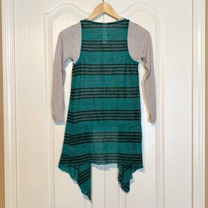 KnitWorks layered Love heart gray top. Long sleeves with ruching at the wrists. Black and Aqua tank racerback style long handkerchief vest that could be worn separately.