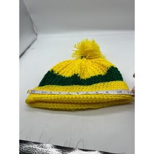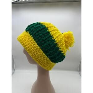 Knit Woven Chunky Wide Stripe Yellow Green Beanie Knit Pom Pom Hat Outdoors Med.
