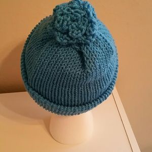 Aqua-blue knit beanie with top knot.