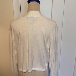 White open cardigan, falls at the waist with 3/4 sleeves. Soft knit, excellent condition.