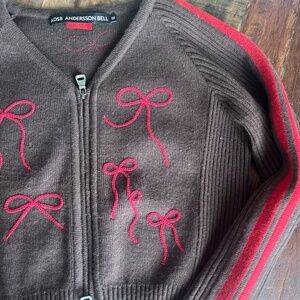 Super cute! Tie bow cardigan, double zipper crop style. Brown and red knit with bows embroidered!