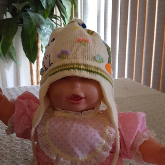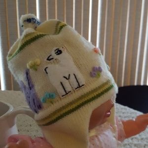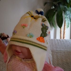 Very adorable white hat with animals, sun and flowers for your little one. Unisex. Warm and comfy.