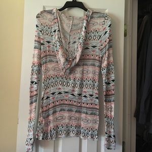 Light weight long sleeve knit shirt with hood and aztec like design. Perfect for a cool summer night or chilly fall day. Practically new. No damage.
