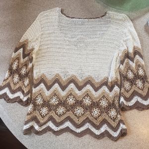 cream, brown, and tan knit/crochet top, 1/2 length sleeves with cute pattern/design! a few loose threads but these are barely noticeable. from a smoke free home!