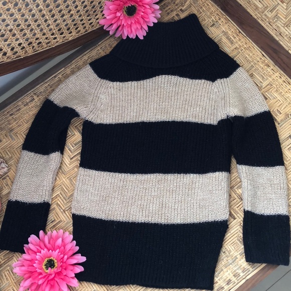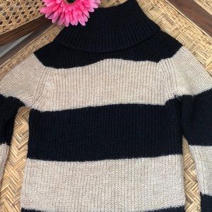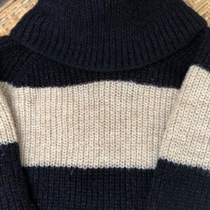 Knit pullover turtle neck type sweater two tones cream and very dark blue with minimal specks of glitter or shiny specs.