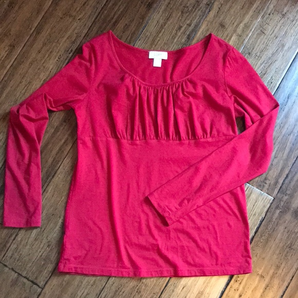 Cotton knit pullover, long-sleeved top; with gathered bodice & seam detail just under bust. Round neckline, seam goes all around.