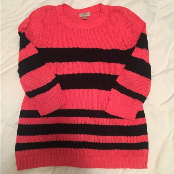 Knit sweater, coral and navy, 3/4 length sleeves