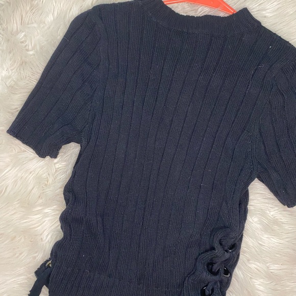Knit black top Strings lacing sides Cropped tee Ribbed