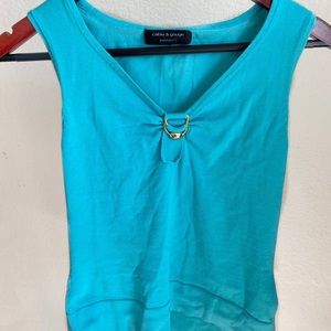 Blue knit top with gold ring at center