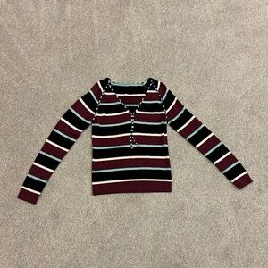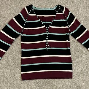 I bought this top in a small boutique in Hong Kong and have always loved it. It’s very comfortable with long sleeves and hits at waist. Unfortunately I cut off the tags because they were scratchy but can tell you it’s rayon and dry clean. It’s a stretchy knit, not like a teeshirt and it’s a bit dressier.