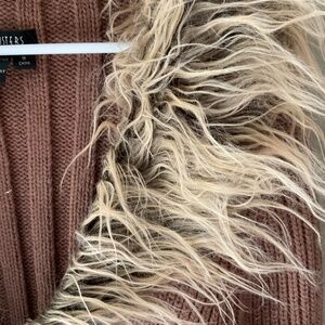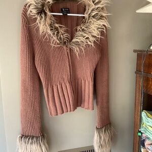 Knit zipper cardigan with faux fur collar and cuffs. Dark tan