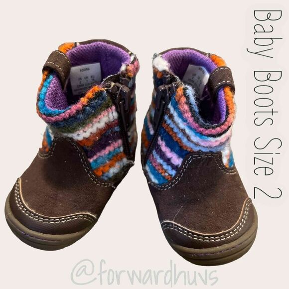 This listing showcases a pair of adorable knit Surprise baby boots made by Stride Rite. These boots are specifically designed for toddlers and babies in size 2, making them perfect for little feet. They are not only functional but also irresistibly cute.