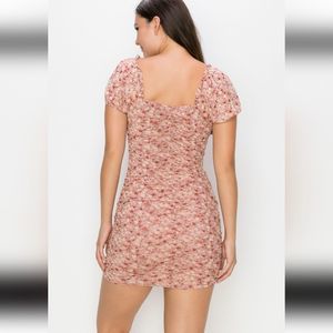 A knit mesh fashionable dress in an allover ditsy floral print featuring a sweetheart neckline, ruffled trim hem, short sleeves, square-cut back, ruched design, bodycon silhouette, and a mini length. great for get-togethers, parties and more