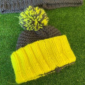 Knitted Beanie Winter Hat w/Pom-Pom and Infinite Scarf Yellow Neon Grey Kids Set