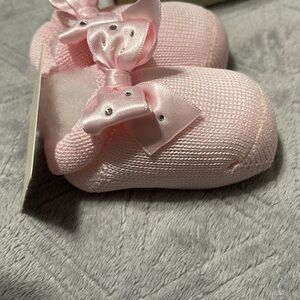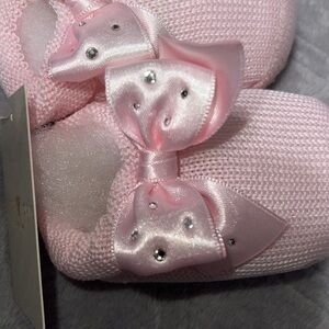 Baby girls pretty pink, short booties, made in stretchy, finely woven cotton. They have rolled down cuffs, with a gorgeous pink satin bow with Swarovski crystal , on the front.
