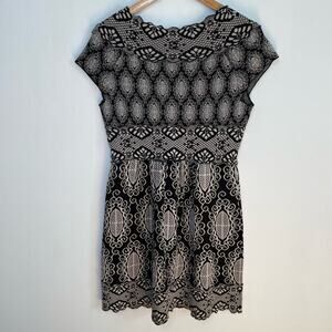 Knitted & Knotted Anthropologie Womens Black and White Printed Cap Sleeve V Neck Scalloped Trim Wool Blend Mini Dress