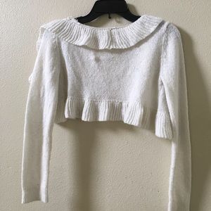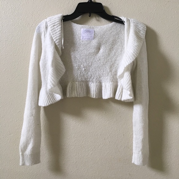 White with slight sparkle in the yarn. Ruffled cardigan. Soft knit. Super cute over tanks or other cute tops. Worn 2-3 times.