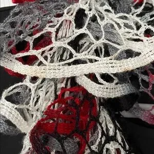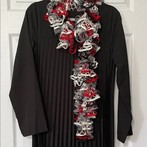 A knitted ruffled scarf in red, gray, ivory and black. Good used condition. There is a couple small spots as seen in pic 3.