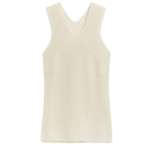 Sleeveless cotton top knitted in a half cardigan stitch. Styled with a soft V-neck at both front and back.
