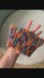 A multicolored (blue, teal, red, yellow-orange) sparkly handmade knitted headband. Hardly worn. Made in Peru.