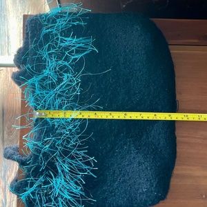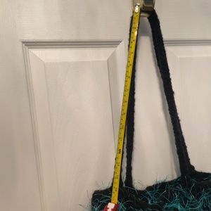 Cute and cozy purse/bag. Knitted black wool with teal feathery strings embedded. No interior pockets.