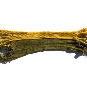 lightweight winter warm scarf. It is a unique split knitted patterned short scarf. It can open as a circular layered scarf. The yellow side has a wide yarn diamond knitted pattern. The green side has a thin yarn tight knitted pattern. The scarf is 22 inches long and has tassels that are 8 inches long. It can be worn in various ways including as a turtleneck. An all around great scarf to have.
