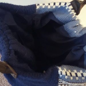 This sweater knitted purse is beautiful with lots of space. The top buttons together and has leather shoulder straps.