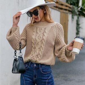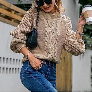 Comfy and cute mock neck sweater in a neutral beige color. This sweater is perfect for the beach, summer evenings, and fall wear. Made of 100% acrylic.